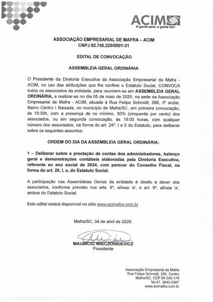 Local: Auditório da ACIM – R. Felipe Schmidt, 266, 3º andar, Centro I Baixada – Mafra/SC