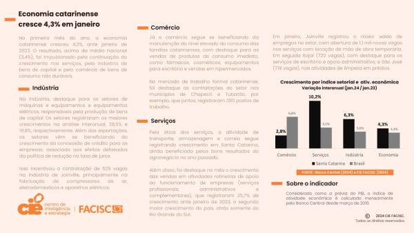 No primeiro mês do ano, a economia catarinense registrou um crescimento de 4,3% em comparação com janeiro de 2023.