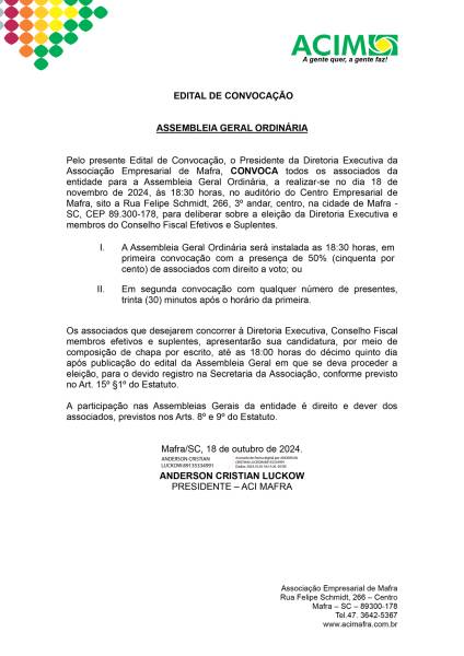 Pelo presente Edital de Convocação, o Presidente da Diretoria Executiva da Associação Empresarial de Mafra, CONVOCA todos os associados da entidade para a Assembleia Geral Ordinária, que terá como pauta principal: