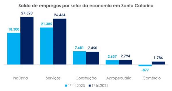 Na indústria, o destaque foi o setor alimentício, com 4,1mil vagas, estimulado sobretudo pela produção nos frigoríficos catarinenses. Apesar do menor preço internacional em relação a meados de 2023, a carne suína registrou recorde na quantidade exportada no 1º trimestre. A fabricação de alimentos prontos, como os pós alimentícios, molhos e condimentos, também estimulou o mercado de trabalho formal no estado. O segmento vem sendo incentivado pelo dinamismo do mercado de trabalho, que acaba potencializando o consumo das famílias, que já está em patamar elevado em Santa Catarina desde 2022.
