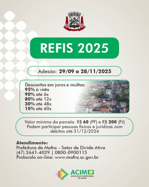 Empresários e contribuintes de Mafra já podem aproveitar o REFIS 2025, o novo Programa de Recuperação Fiscal do município. Lançado pela Prefeitura, o programa tem como objetivo facilitar a regularização de débitos municipais, tanto para pessoas físicas quanto jurídicas, oferecendo descontos especiais em juros e multas.